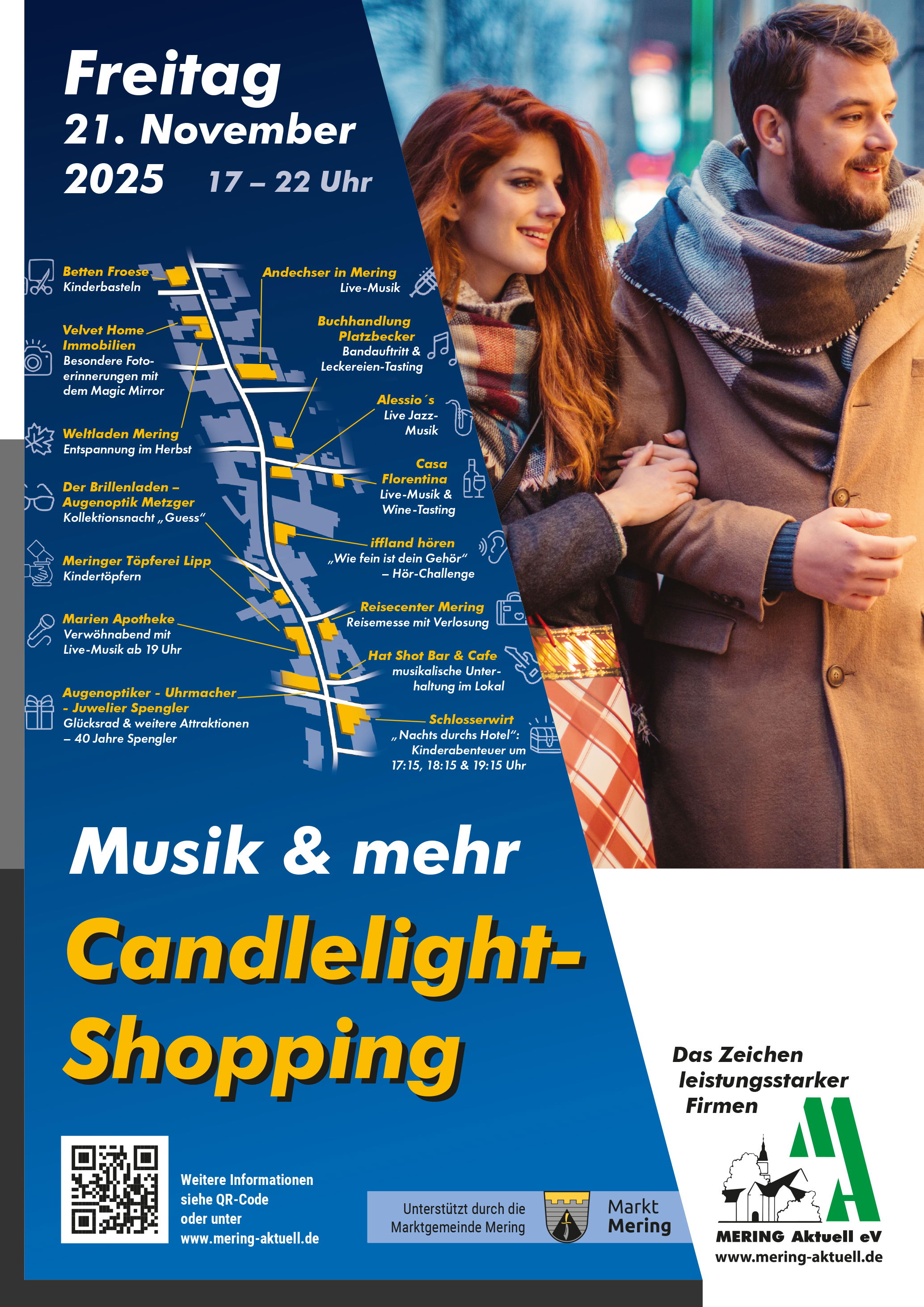 Am Freitag, den 21.11.25 fand von 17-22 Uhr bei Kerzenschein & Beleuchtung das von Mering Aktuell e.V. initiierte & mit Unterstützung durch die Marktgemeinde Mering umgesetzte Candlelight-Shopping mit neuem Konzept in der Meringer Ortsmitte (Hauptstraße inkl. Seitenstraßen) statt.