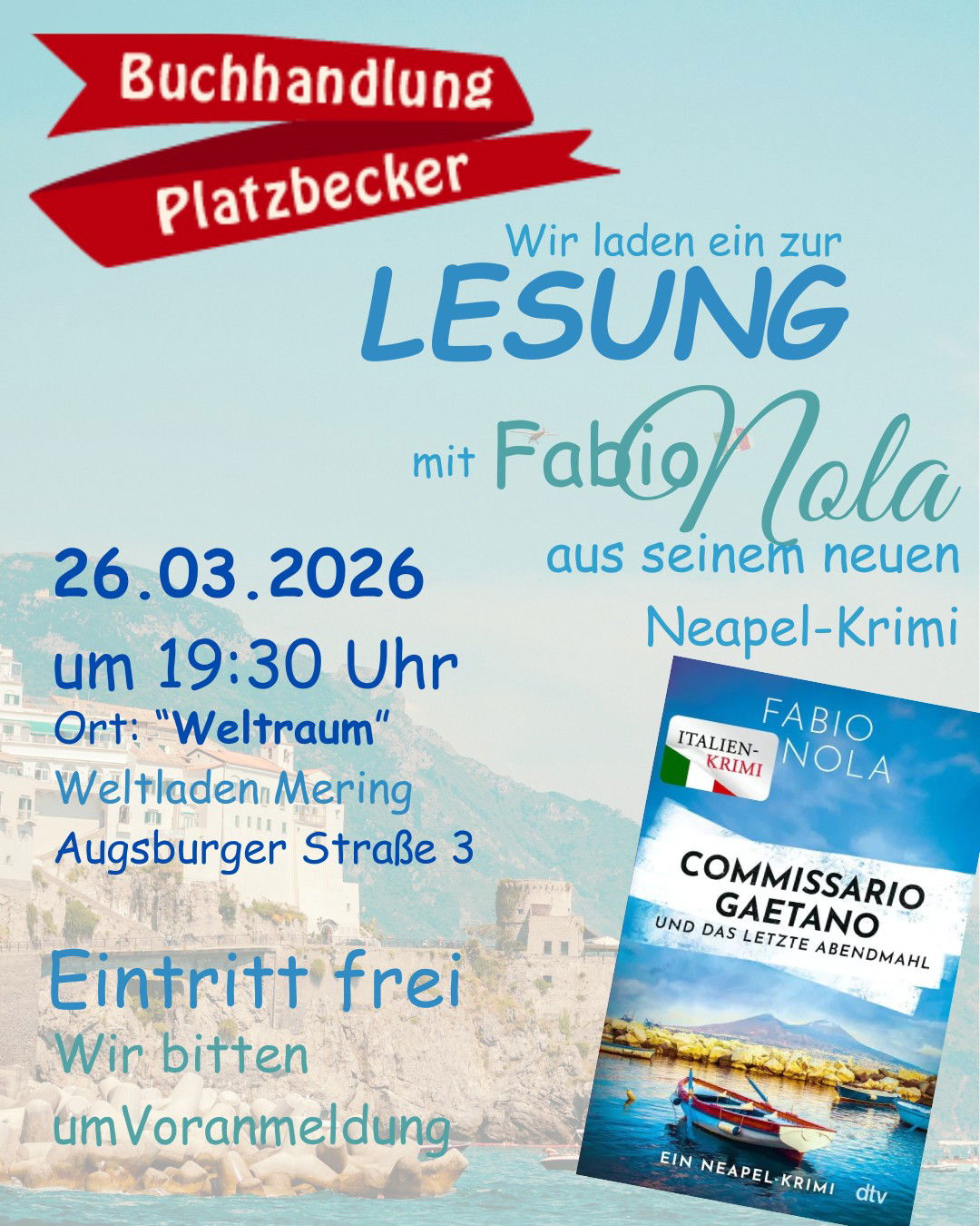 Die Buchhandlung Platzbecker lädt am 26.03.2026 um 19:30 Uhr zur Lesung mit Fabio Nola aus seinem neuen Neapel-Krimi in den "Weltraum" im Weltladen Mering (Augsburger Straße 3) ein.